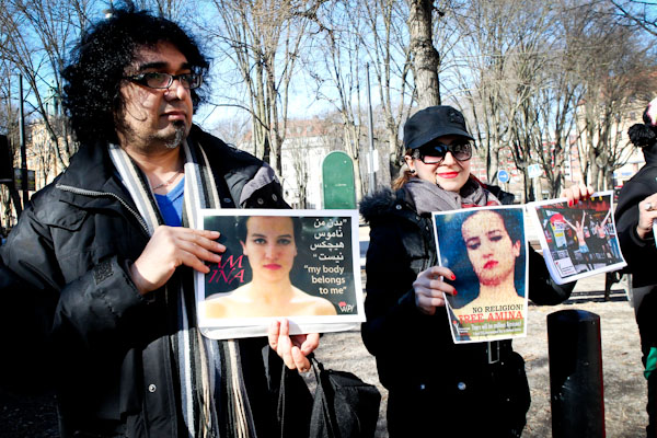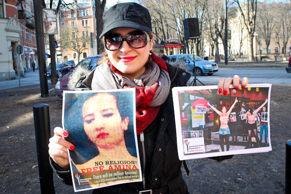 Activists, organized by the radical feminist group Femen, rally outside the Tunisian Embassy in Stockholm, to express solidarity for activist Amina Tyler and to protest against attacks on women’s freedoms. Amina stirred up controversy in Tunisia after posting topless protest photos on Facebook.