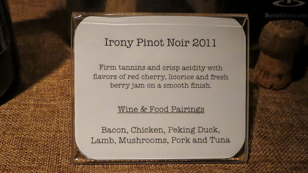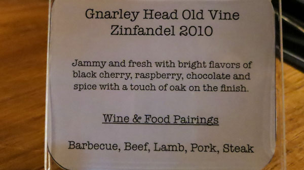 My favorite wine for the evening was the Irony Pinot Noir, but I also liked the Gnarley Head Zinfandel.